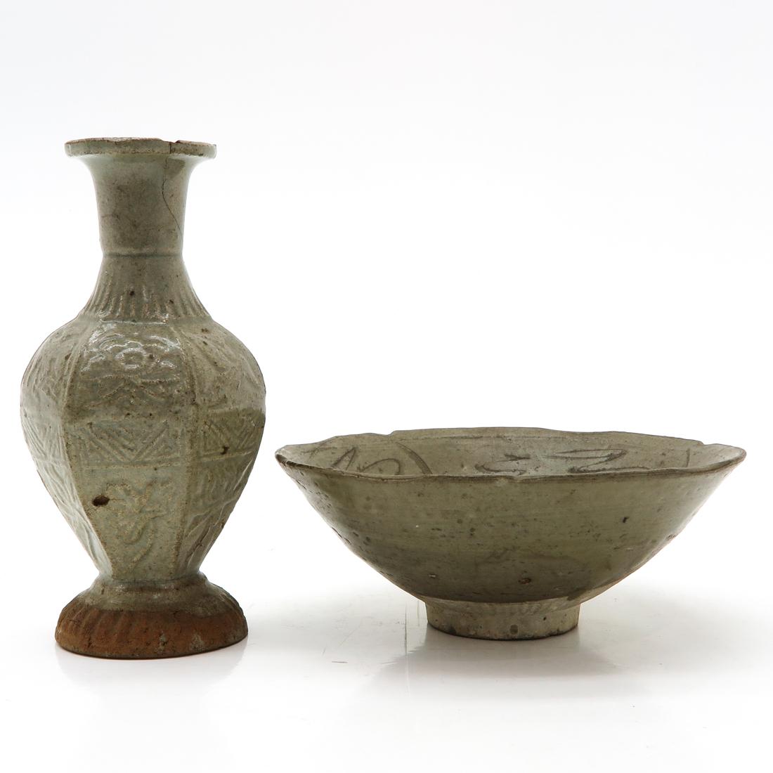 SoldVASE & BOWL - (2) Pcs of 19th c. Chinese Blue & WhiteVASE & BOWL - (2) Pcs of 19th c. Chinese Blue & White Porcelain, including: Bottle form flared rim vase with floral and butterfly motifs, 6 1/2" high, 3 1/4" diameter; and Low bowl decorated with wateSee Sold Price