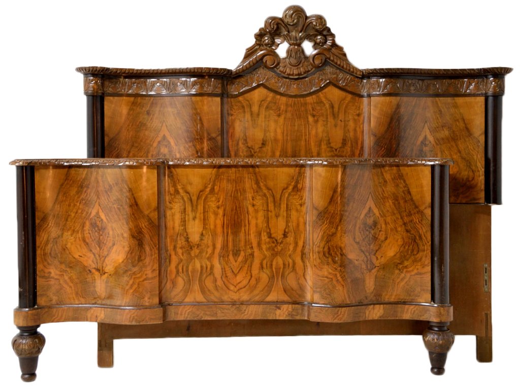 SoldORNATE BAROQUE-STYLE BED Late 19th Century Bed width 64”.ORNATE BAROQUE-STYLE BEDLate 19th CenturyIn walnut and brown paint with cherub and floral carvings. Bed width 70”. Distance between the rails for a mattress is 63”. Height of headboard 83&See Sold Price