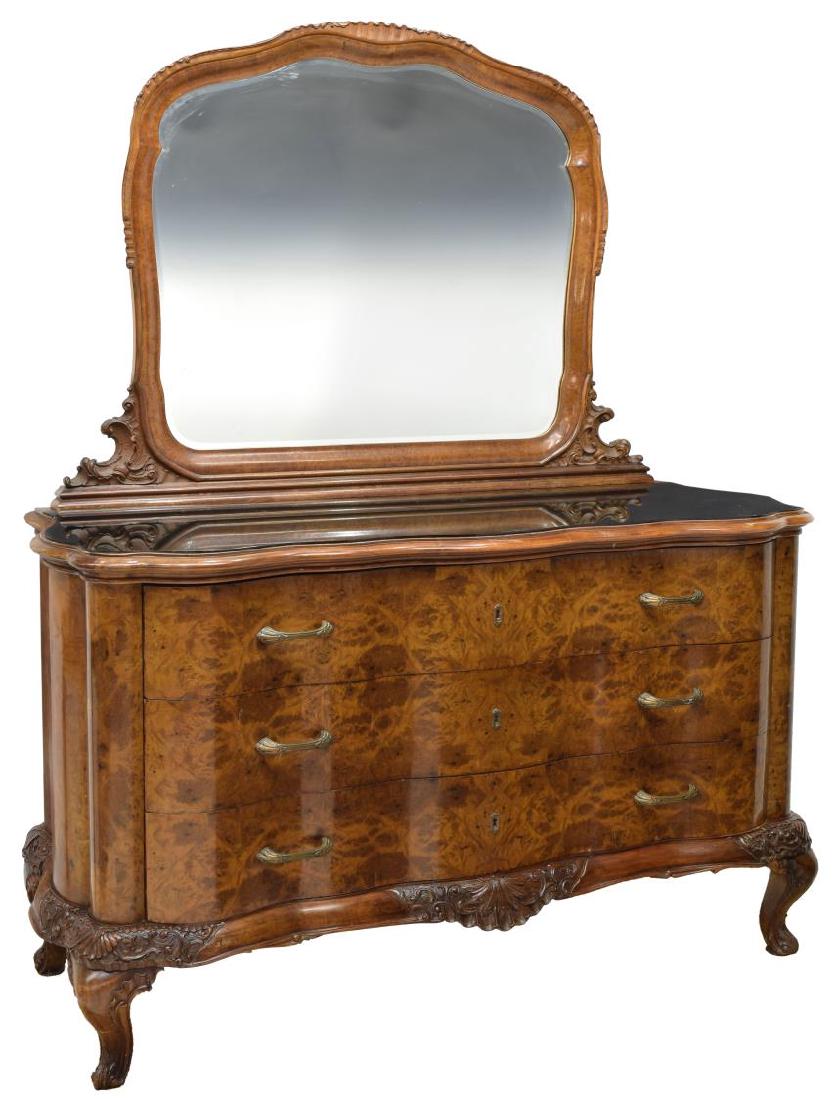 SoldITALIAN ART DECO FIGURED WALNUT MIRRORED COMMODEItalian Art Deco figured walnut dressing commode, c.1930s-1940s, arched frame with flat mirror plate, shaped case fitted with four drawers, rising on carved legs, approx 70.5"h, 47.5"w, 21.5"d Start PSee Sold Price