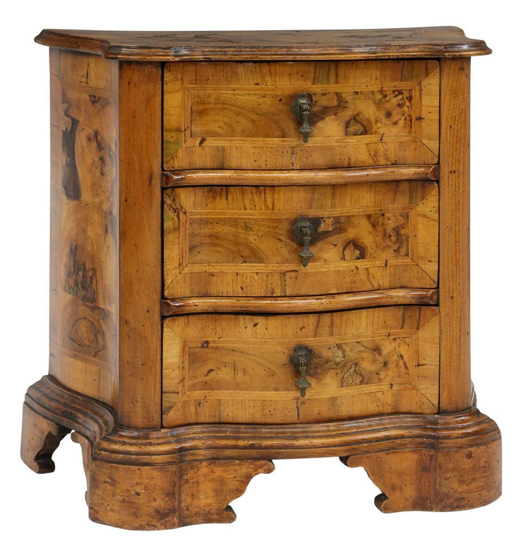 SoldITALIAN VENETIAN PATCHWORK BEDSIDE CABINETItalian Venetian patchwork bedside cabinet, 20th c., serpentine case with burlwood inlay, parquetry banding, fitted with three drawers, rising on bracket feet, approx 25.25"h, 19"w, 14"d Start Price:See Sold Price