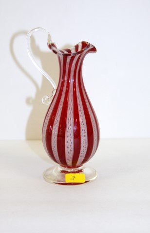 Venini pitcher, red, white, clear, applied handle
