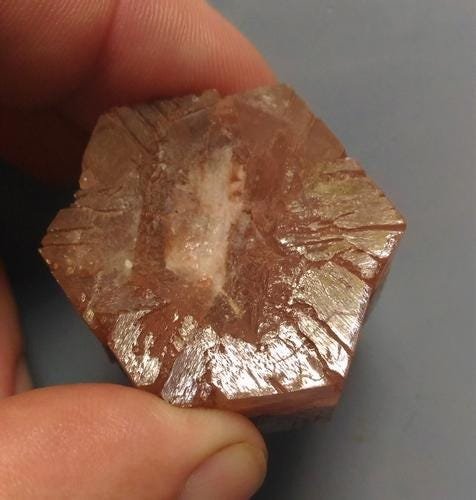 SoldHEXAGONAL ARAGONITE CRYSTALTitle: HEXAGONAL ARAGONITE CRYSTAL Origin: Minglanilla, Cuenca, Spain Size: 1.6x1.4x0.8 cm / 4 gram Description: translucent hexagonal aragonite crystal with striated surface Reserve: $5.00 Shipping:See Sold Price