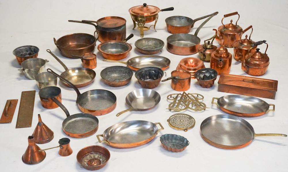 Graduated Set of Antique French Copper Saucepans with Iron Handles