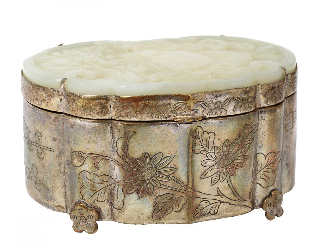 VERY FINE WHITE JADE MOUNTED SILVER BOX