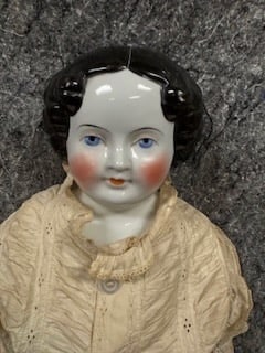 SoldAntique DollAntique doll. Large china head doll. Black hair. Cloth body. Leather stitched arms and hands. 22” Circa 1880See Sold Price