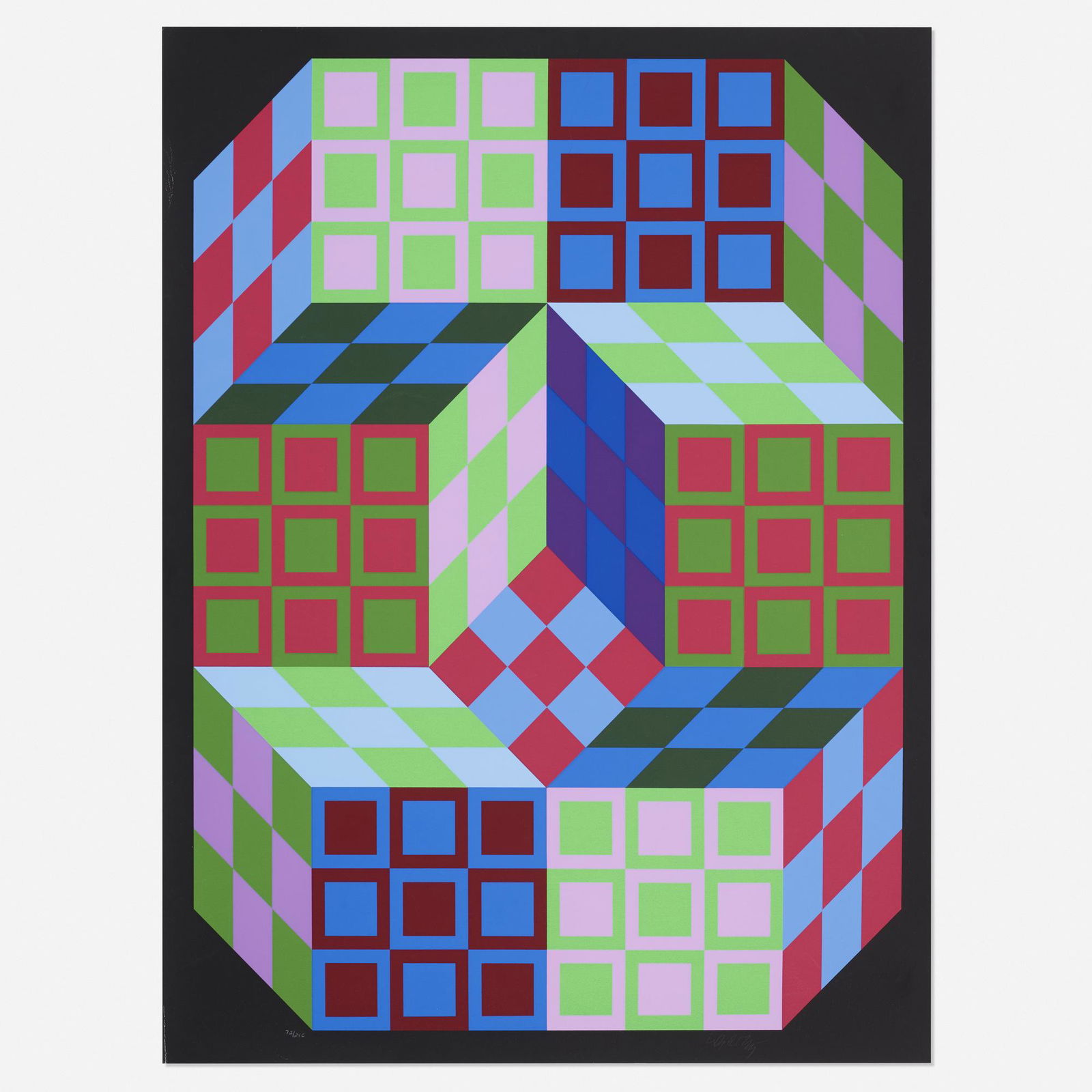 VICTOR VASARELY (Hungarian / French, 1906-1997). Hexa-Oltar, 1976, Individually cut-and-pasted colorVICTOR VASARELY (Hungarian / French, 1906-1997). Hexa-Oltar, 1976, Individually cut-and-pasted color paper tiles in a tesselation configuration mounted on a hard black surface. Pencil signed at base (