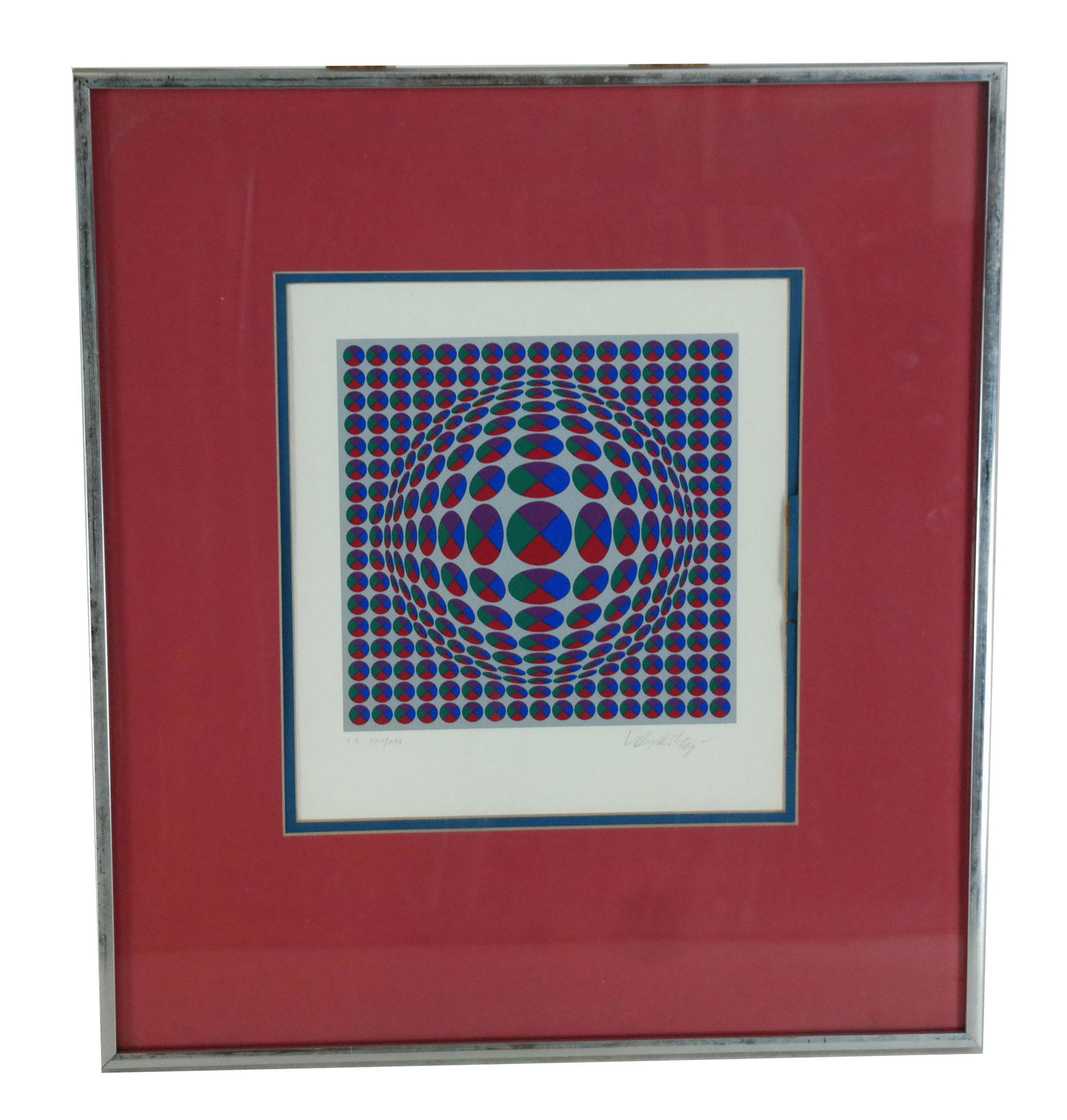 SoldVictor Vasarely LithographPrivate Collection 20" x 17.5" Vasarely was born in Pécs and grew up in Pöstyén (now Piešťany, Slovakia) and Budapest, where, in 1925, he took up medical studies at Eötvös Loránd UniversitSee Sold Price