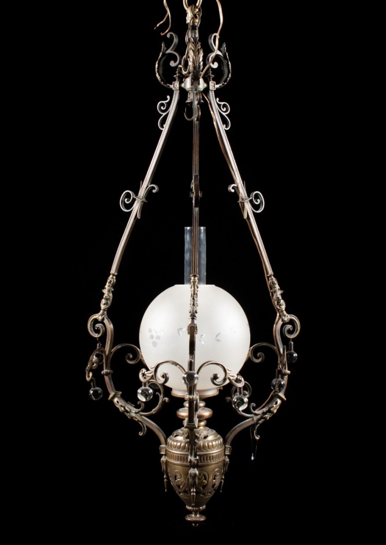 SoldAntique Victorian period hanging oil lamp, light fixtureVictorian period hanging brass oil lamp, fixture with shade.See Sold Price