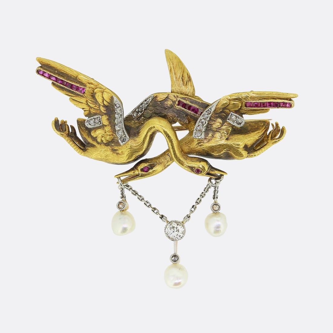 Victorian Double Stork Ruby Pearl and Diamond Brooch