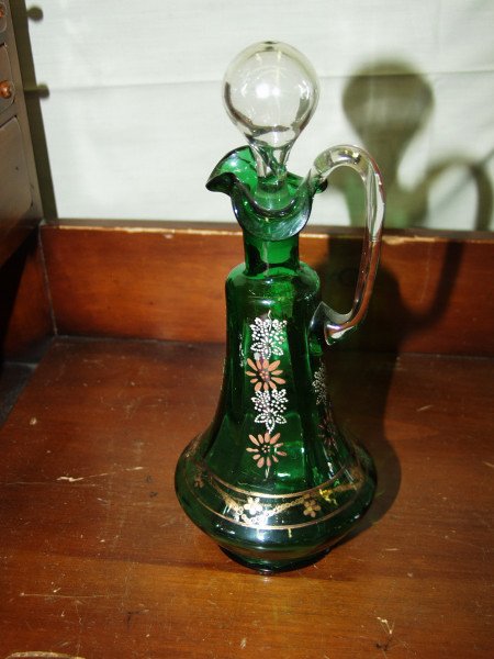 SoldVictorian Green Art Glass Cruet Decanter Lily of theVictorian Green Art Glass Cruet Decanter Lily of the Valley Decorated cruet, clear glass handle and stopper, hand painted enamel and gilt lily-of-the-valley decoration Approximately 10 _ inches.See Sold Price