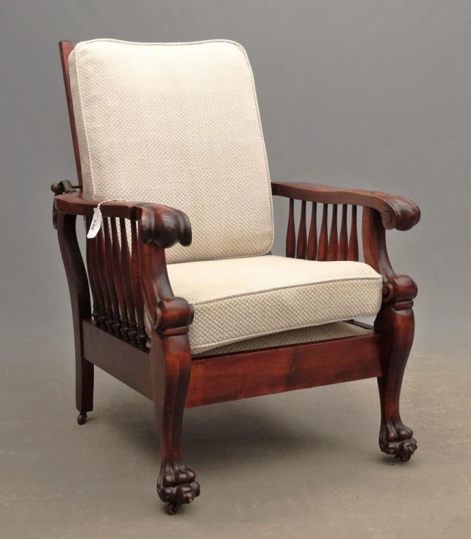 SoldVICTORIAN MAHOGANY MORRIS CHAIR, WIDE ARM,ACANTHUS CARVING, TURNED & REEDED FEET, SIDE SPLAT, APPLIED CARVING, OLD FINISH, 37 1/2" H, 29 1/2" W, 30" DEEPSee Sold Price