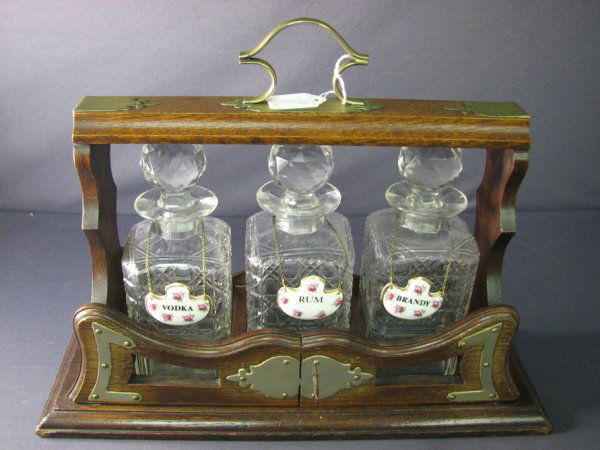 VICTORIAN OAK AND CRYSTAL TANTALUS SET