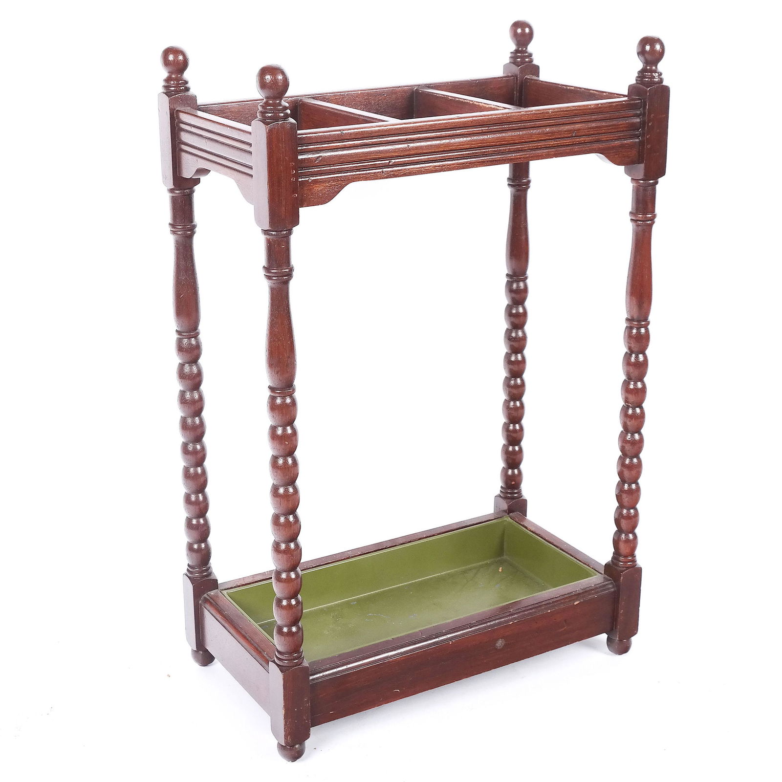 SoldVICTORIAN OAK STICK AND BALL UMBRELLA STAND WITH METAL DRIP PAN C 1895.Victorian oak stick and ball umbrella stand with metal drip pan C 1895. Ht: 25" Wd: 12" Dpth: 7"See Sold Price
