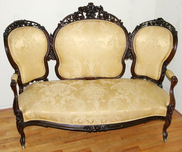 SoldTriple back Victorian Rosewood Parlor SofaExquisite mid-19th century triple-back parlor sofa crafted in rich rosewood, showcasing deeply carved crests, foliate scrollwork, and elegant cabriole legs on original brass casters. Newly reupholsterSee Sold Price
