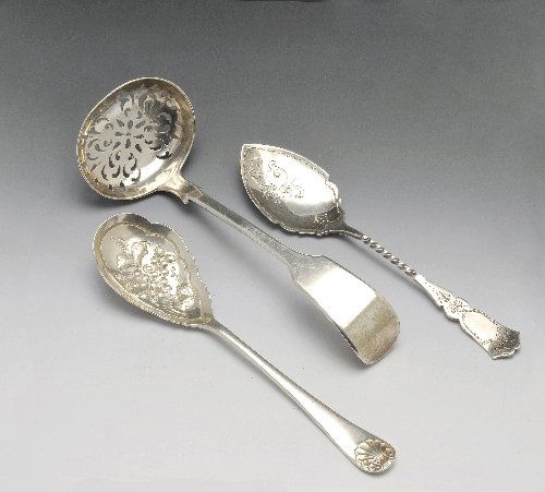 Victorian silver sifter spoon, two later preseve spoons
