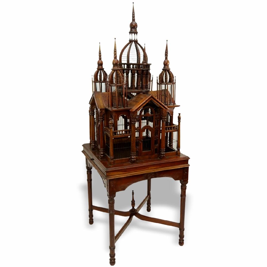 SoldVictorian style architectural birdcage on stand, 68"hVictorian style mahogany & wire birdcage, of architectural form in the style of a Raj palace, the central dome resting on Corinthian style columns above the gabled roof with four turrets surmounted bySee Sold Price