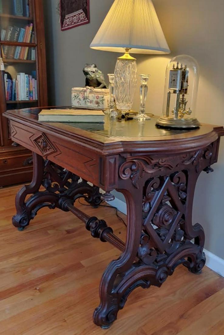 SoldVictorian Library Table attributed to George HenkelsA highly carved walnut and mahogany Victorian library table or partners desk attributed to the hand of George Henkels (1819-1883 working in Philadelphia) circa 1860. The four legs supporting the frameSee Sold Price