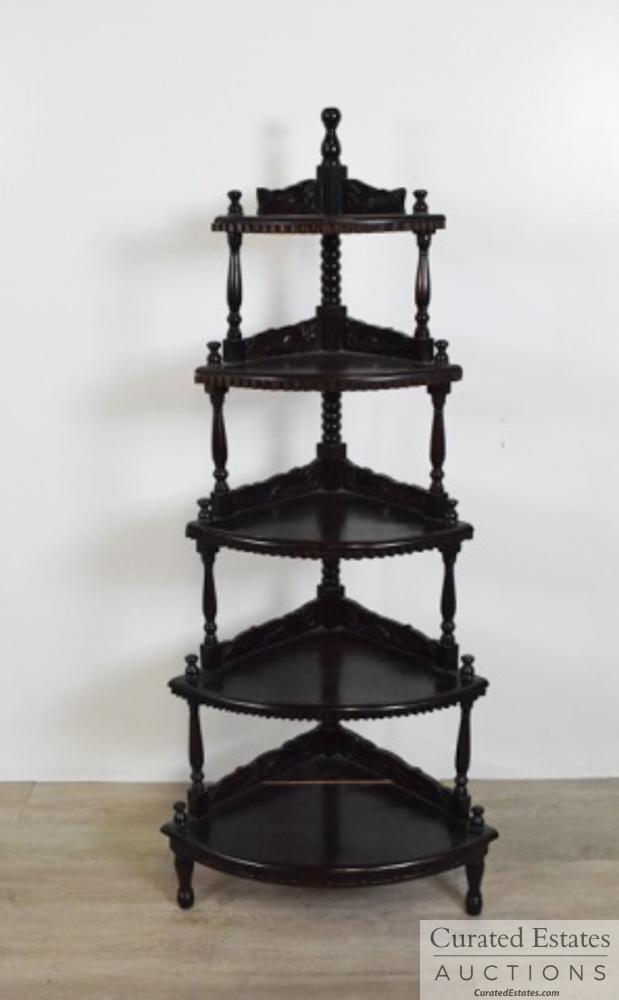 A Pair of George III Style Mahogany BookcasesVictorian Antique Walnut Etagere 5 Shelves Cut Out Fretwork C18901 day LeftAUSTRIAN BIEDERMEIER-STYLE BURLED AND PARCEL-EBONIZED CORNER ETAGERE, circa 1920, unmarked, ht. ...1900s Inlaid 3 Level Display Etagere' ShelfVICTORIAN CAST IRON PLANT STAND WITH ONYX TOPSFeb 22, 2026American Federal Stained Corner Cupboard6 days LeftVintage 19th Century Bamboo Etagere with Brass Finials49 mins LeftFancy brass etagere with glass & onyx shelf, missing 3 small round glass shelves, , 32.5" wide, 11"4 days LeftGillows English Regency Brass-Mounted Mahogany 5-Tier Corner Shelf717 Lots AwayVintage Wooden & Metal CD Rack 37in6 days LeftIrwin Furniture Company Dumb Waiter Mahogany Three Tier Silent Butler With Claw FeetTABLETOP DISPLAY STAND3 days LeftChinese Brown Stain Treasure Display Curio Cabinet Room DividerFrench Steel & Polished Brass Baker's RackFeb 06, 2026EARLY 19TH C. CHINESE DISPLAY ETAGEREFeb 22, 2026WROUGHT IRON CORNER SHELF3 days Left