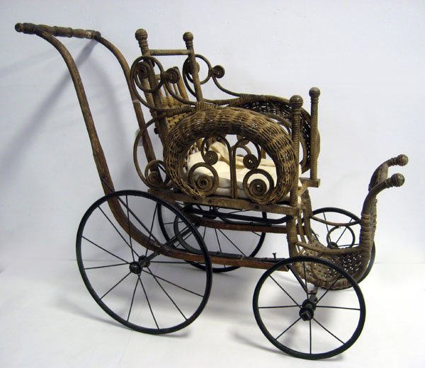 Victorian wicker doll stroller with adjustable back and