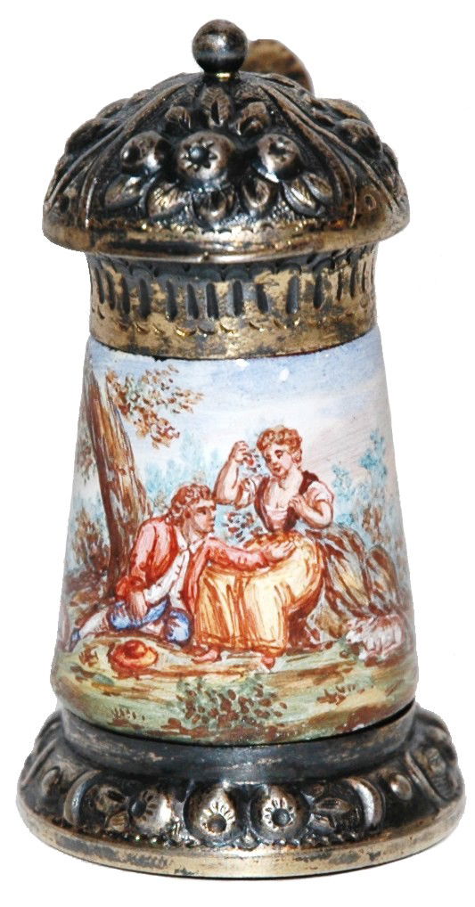Viennese and Austrian enamel painted miniature pitchers and stein, 19th C., three pieces, including:Viennese and Austrian enamel painted miniature pitchers and stein, 19th C., three pieces, including: Viennese pitcher with figural white metal handle, several vignettes throughout featuring courting c