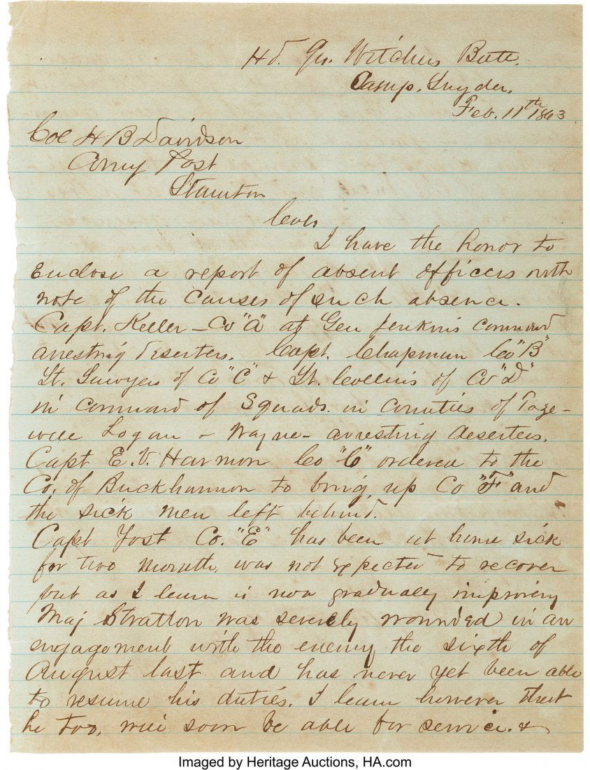 William A. Denny 1st Lieut. Ohio 98th Infantry LetterMar 02, 2026Major William Hunter 32nd Ill. Infantry Hatchie BridgeMar 02, 2026Rheumatism & Hemorrhoids Request for AbsenceMar 02, 2026Folly Island African American Troops, Rebel ShellingMar 02, 2026Willard R. Wetherel NY 60th Infantry Harper's FerryMar 02, 2026Dr. Mudd, Samuel Arnold, and Ned Spangler letterMar 02, 20261863 George Dixon happy enemy retreated, etc.Mar 02, 2026John C. Thorpe VA Courtney Light Artillery LetterMar 02, 2026Union William Henry Noble Brig-General PromotionMar 02, 2026Edmund J. Davis – Texas Governor – Autographed Letter (ALS) Re. Warning Regarding Judge Liberty Foskett: Lee's Surrender, Deserters, etc.Mar 02, 2026Chaplain Letters - Wife's Account Husband's DeathMar 02, 2026Capt. Otis Whitney Leave Request, Iowa Vols, etc.Mar 02, 2026Sword presentation to Ensign Randolph letterMar 02, 2026New England Civil War: Patriotic letter to brother, etcMar 02, 2026Civil War Orders, Prisoner's Oath, Coffin order, etc.Mar 02, 2026