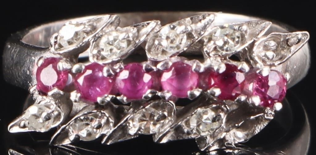 VINTAGE 10K WHITE GOLD RUBY & DIAMOND BYPASS RING