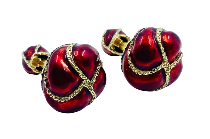 French 18K Gold Red Enamel Cufflinks Signed Hallmarked