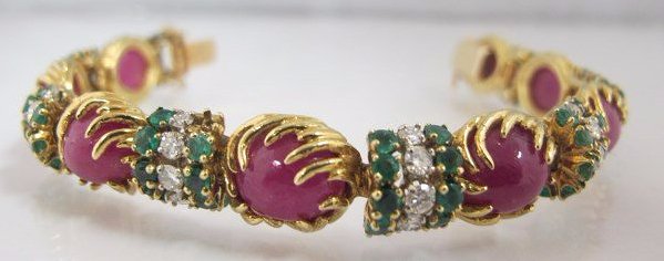 Vintage 18K Yellow Gold Ruby, Diamond, Emerald Bracelet