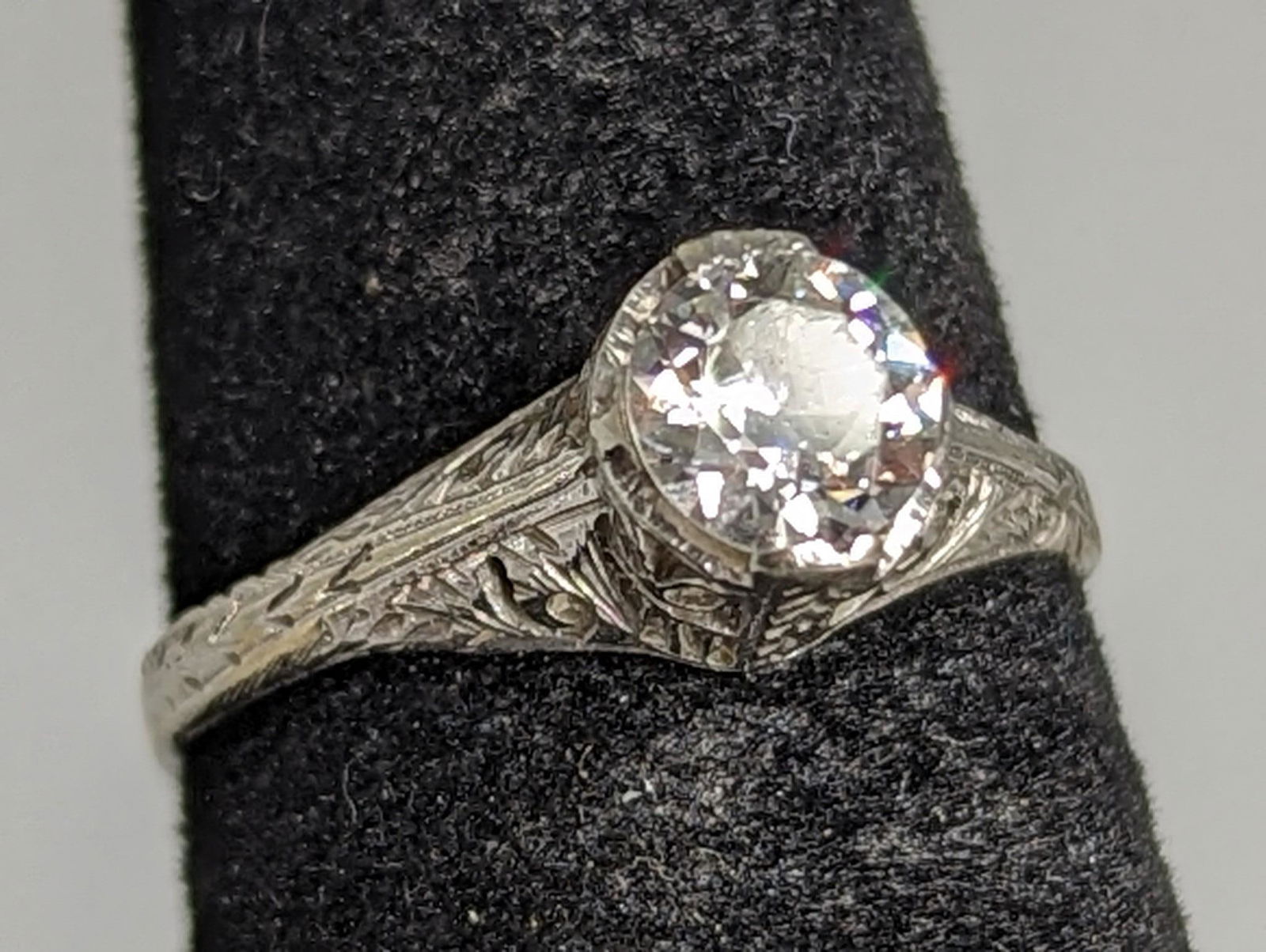 18K white gold vintage solitaire diamond ring with .42 carat Old European cut diamond and engravedRipley Auctions4.4(191)$1002 days Left