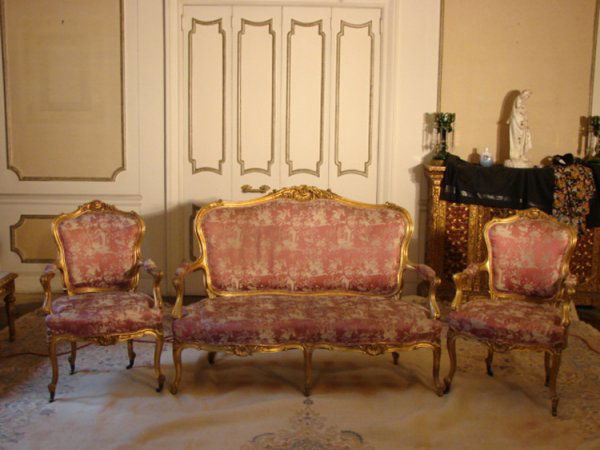 Sold19th Century French 5 Piece Louis XV parlor set with silk brocade fabric, golden threads and gold19th Century French 5 Piece Louis XV parlor set with silk brocade fabric, golden threads and gold braiding around edges, legs are gold gilt with carved rococo embellishments. (1) Love seat measures 52See Sold Price