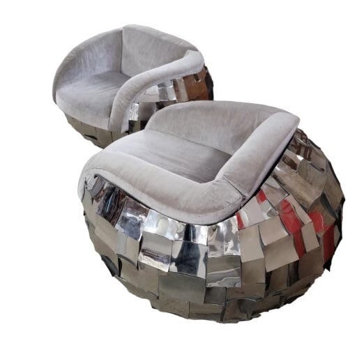 Vintage Brutalist Paul Evans Style Chrome Patchwork Tub Lounge Chairs in a Grey Velvet - Pair