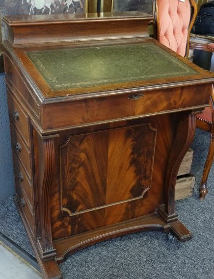SoldVintage Captain's or Davenport DeskVintage captain's or Davenport desk with fall front opening to reveal adjustable angle writing surface and various storage compartments, concealed compartment at top of case, four drawers with knob haSee Sold Price