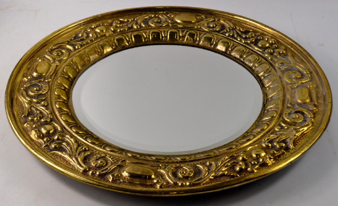 SoldElliptical embossed brass wall mirror, embracingElliptical embossed brass wall mirror, embracing cherubs at crest, gryphons at bottom, beveled edge glass, 31-1/2" h x 18-3/4" wSee Sold Price