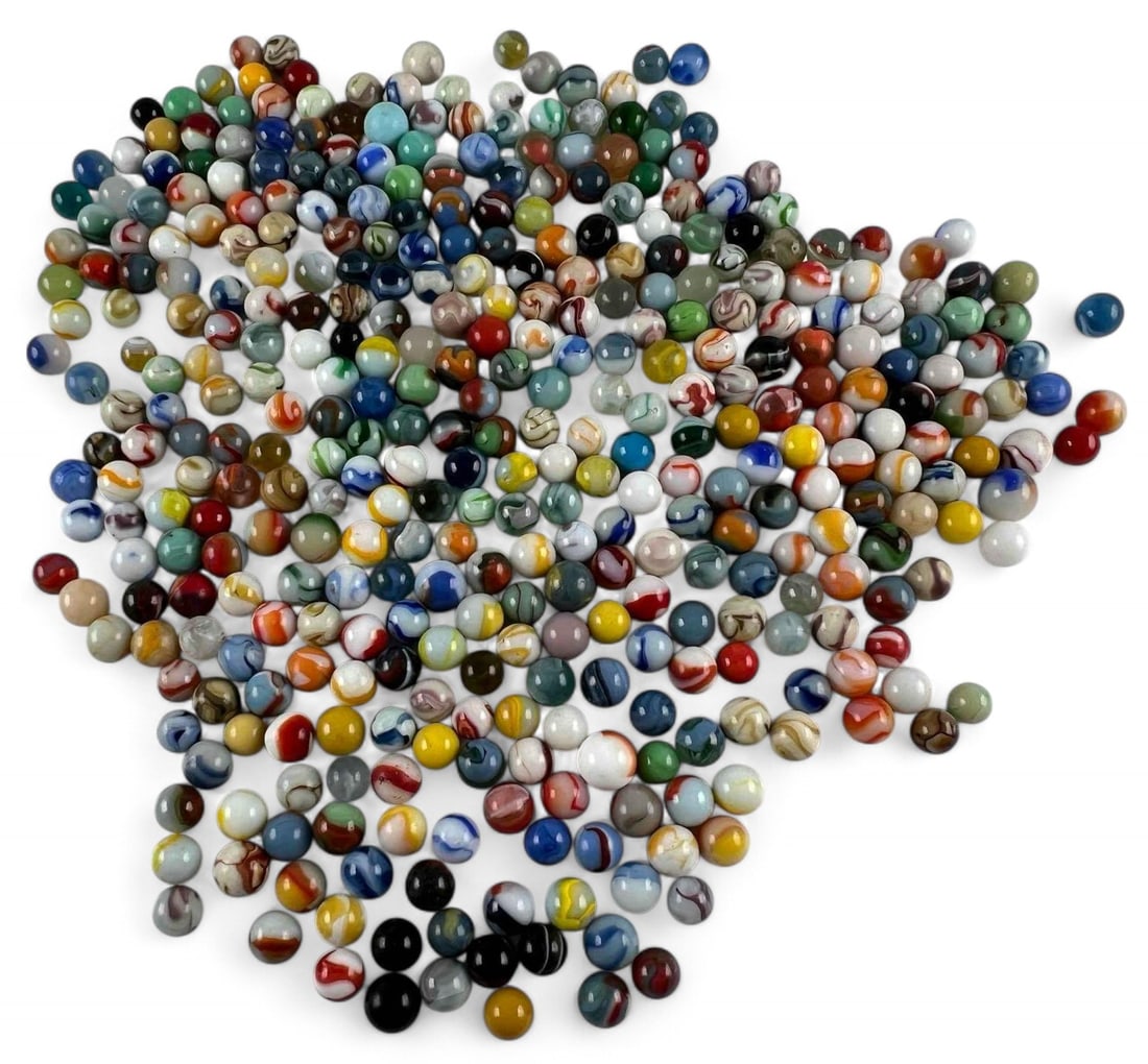 Lot of Vintage Machine Made Glass MarblesThis lot contains a large assortment of vintage machine made glass marbles. The collection features a variety of multi-colored patch, ribbon, and swirl patterns. The marbles measure approximately 5/8See Sold Price