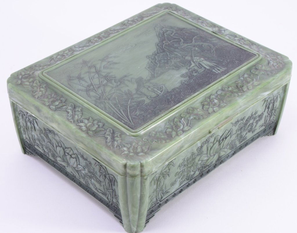 SoldLot 2 Vintage Green Tabletop Jewelry BoxesTwo green hued jewelry boxes. One piece is crafted from composite materials and lined with a black felt style material. The top depicts raised designs that feature an Asian pergola in the mountains. TSee Sold Price