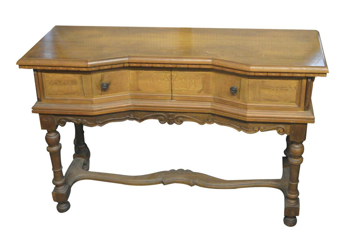 A vintage Italian hand crafted walnut oyster burl wood bombe console table featuring a center drawerA vintage Italian hand crafted walnut oyster burl wood bombe console table featuring a center drawer completed with bronze handle. Crafted with cabriole legs. Bottom has Classic House Furniture Galler