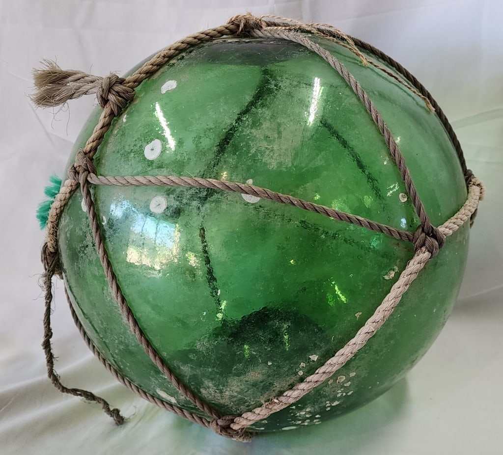 Sold41''Cir. Japanese Glass Fishing Float w/ Kanji Mark - Atq Green Glass Float w/ Original Rope - From41''Cir. Japanese Glass Fishing Float w/ Kanji Mark - Atq Green Glass Float w/ Original Rope - From Capitola Wharf House RestaurantSee Sold Price