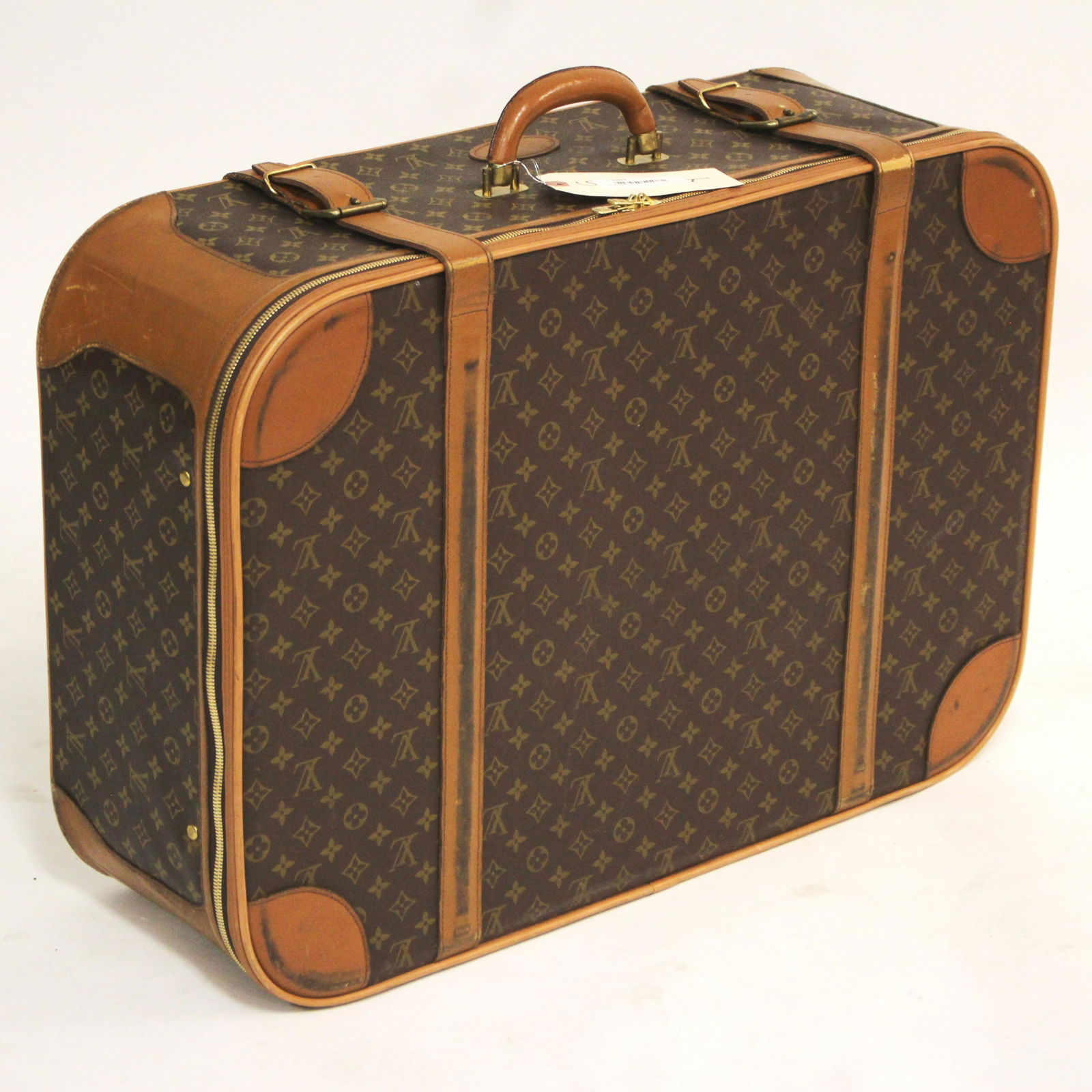 SoldLouis Vuitton Soft Side Luggage CaseVintage Louis Vuitton soft side luggage suit case in signature LV monogram design on brown leather, with two buckles, gold-tone hardware, original leather bag tag, and top handle, marked "LOUIS VUITTOSee Sold Price