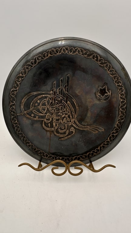 Vintage Mid-Eastern Brass with Silver Copper tray arabic script tugrah