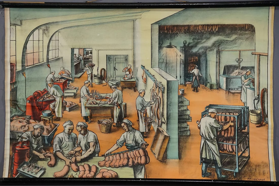 Vintage Mural Wall Chart View into a Butcher shop Meat Processing