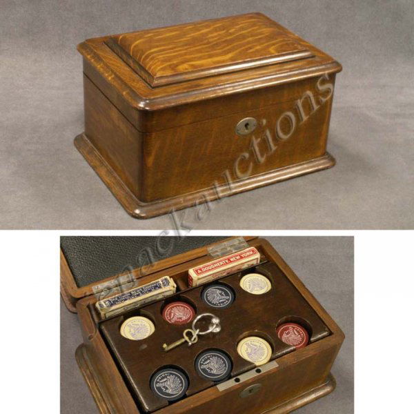 VINTAGE OAK CASED POKER SET (CHIPS/CARDS), C.1910