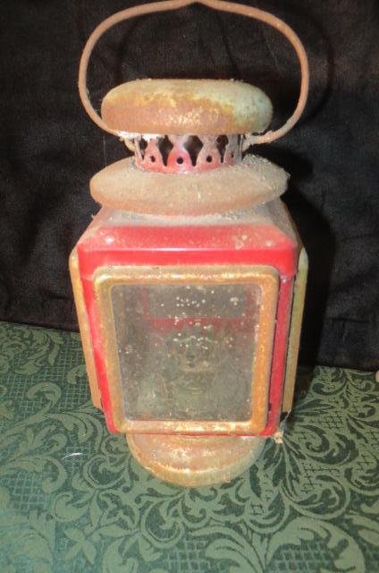 SoldSHEET-IRON / TIN LARGE STATION OIL LANTERNSHEET-IRON / TIN LARGE STATION OIL LANTERN, original red painted surface, triangular form raised on three short legs with air-draft holes, top with an ornamental sawtooth edge, central perforated capSee Sold Price