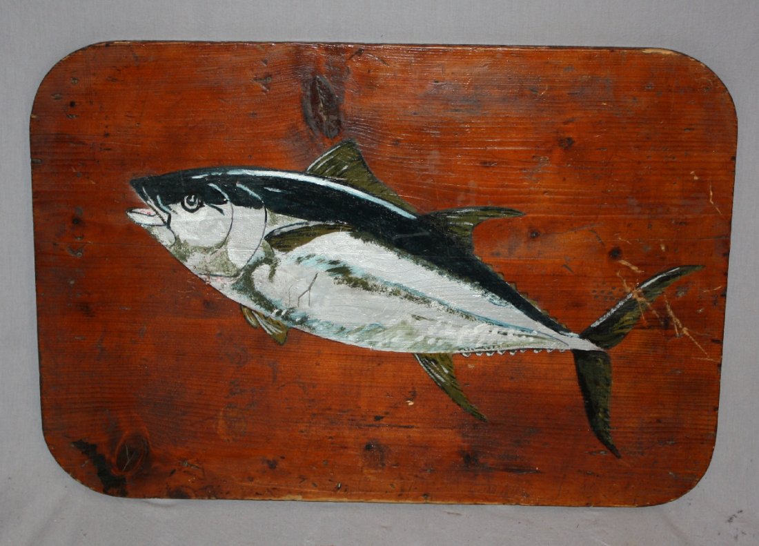 Vintage painted panel depicting a tuna