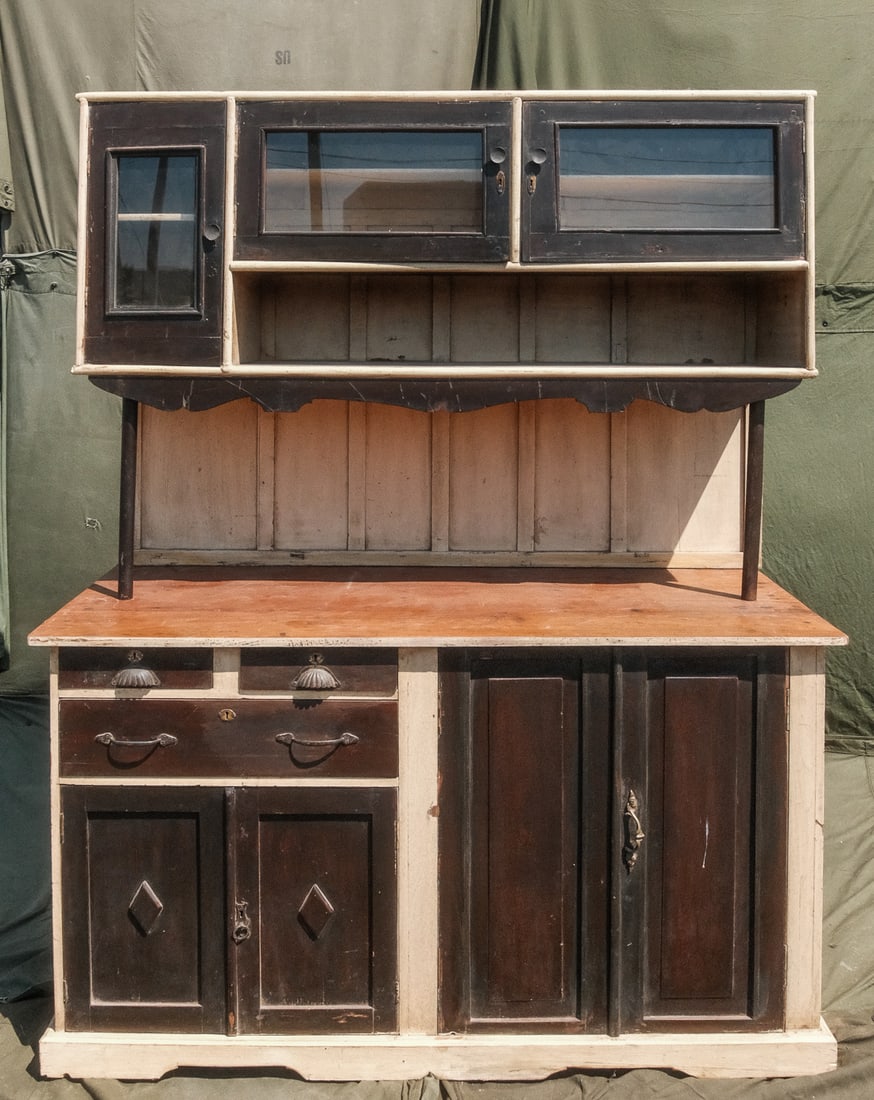 SoldHungarian Kitchen CabinetA beautiful example of a vintage kitchen pantry cabinet from a Hungary Farmhouse. This cabinet has primitive style attributes including dove tail edges and limited use of nails.See Sold Price