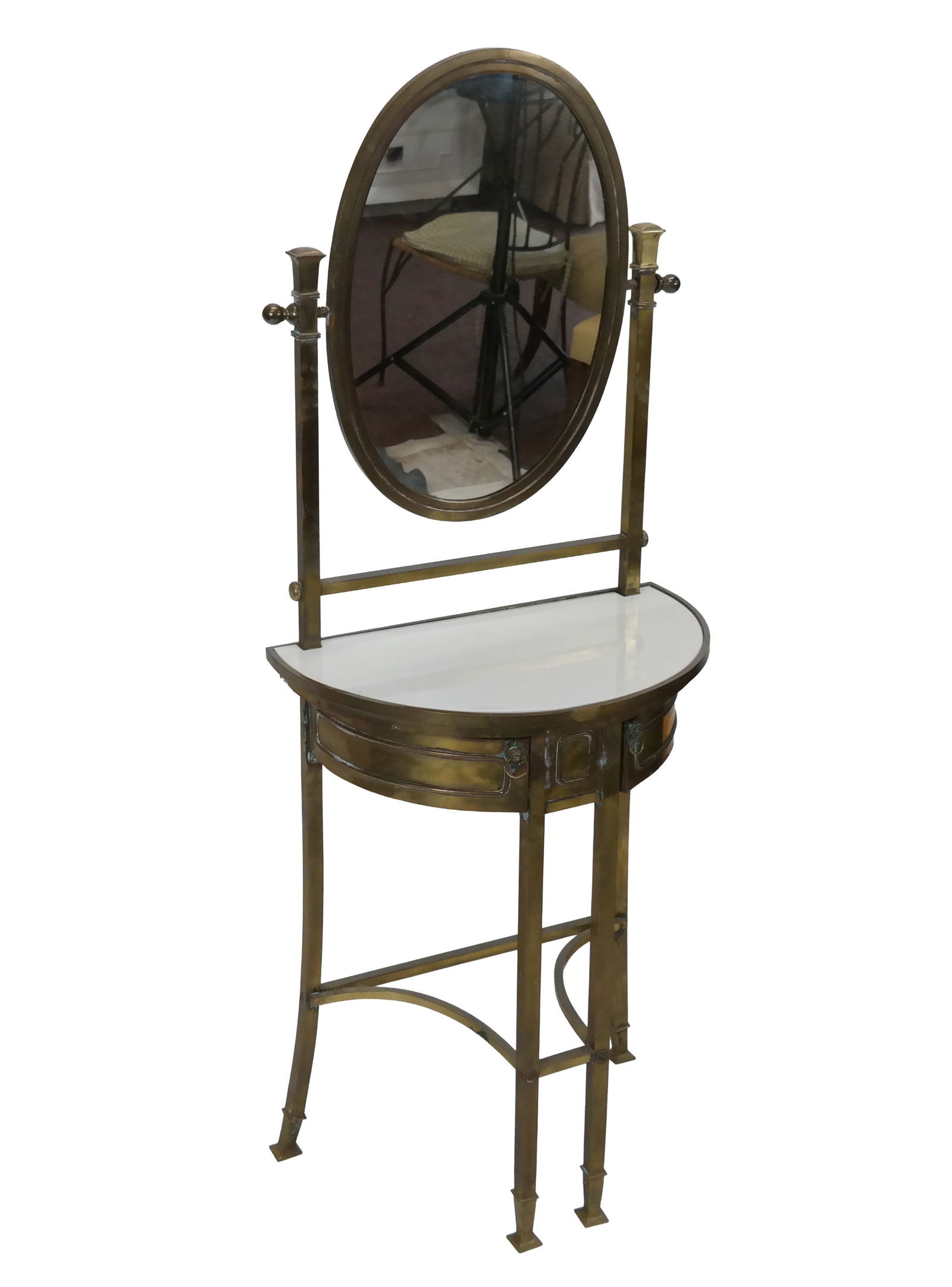 SoldVintage Regency Vanity StandAll-brass vintage Regency vanity stand with milk glass top, of demilune shape, with two swing drawers (wood-framed) with oval swing mirror mount. [58" H x 23" W x 13.5" D].See Sold Price