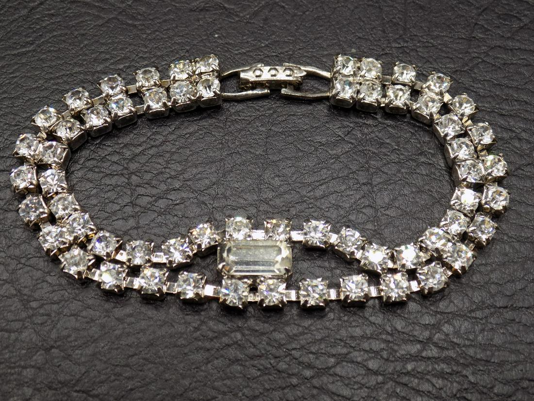 SoldVintage Clear Rhinestone Bracelet, Signed Ledo, 1940's, 7.75"Vintage Clear Rhinestone Bracelet, Signed Ledo (for Ledo Polcini), 1940's, 7.75" and 1-1/8" wide. Original stones nad all present. Is missing the safety chain. Rhodium plated with clear round and baguSee Sold Price