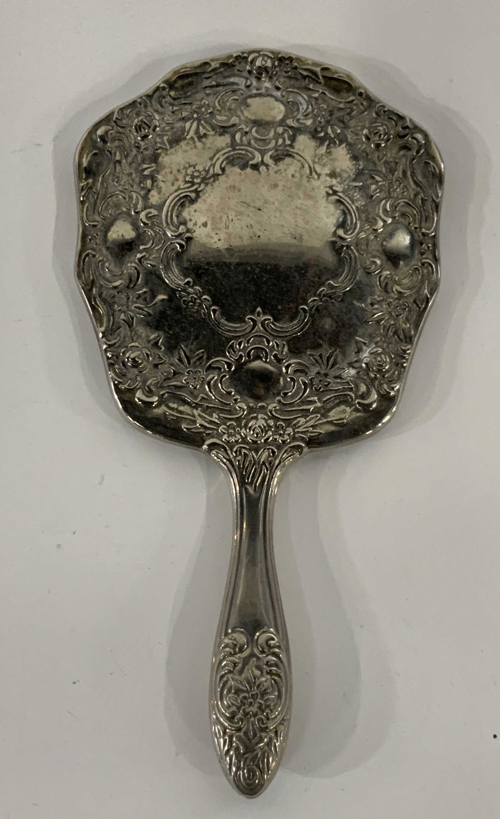 SoldVintage Sterling Silver Hand Mirror PendantVintage sterling silver hand mirror pendant. Embossed scroll motif on silver. Marked 925. Measures approx. 3 x 1.25 inches. Total weight 15.7 grams. Some surface wear including scratching observed. StSee Sold Price