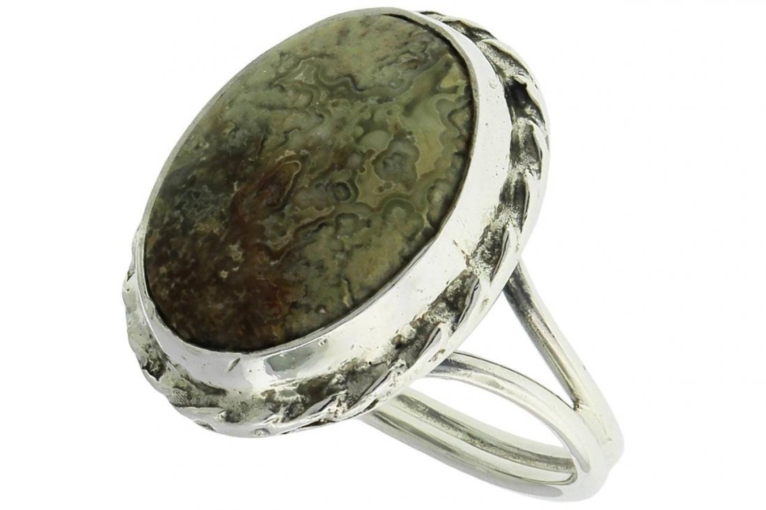 VINTAGE STERLING SILVER RING GREEN BAGE GEMSTONE ROPE