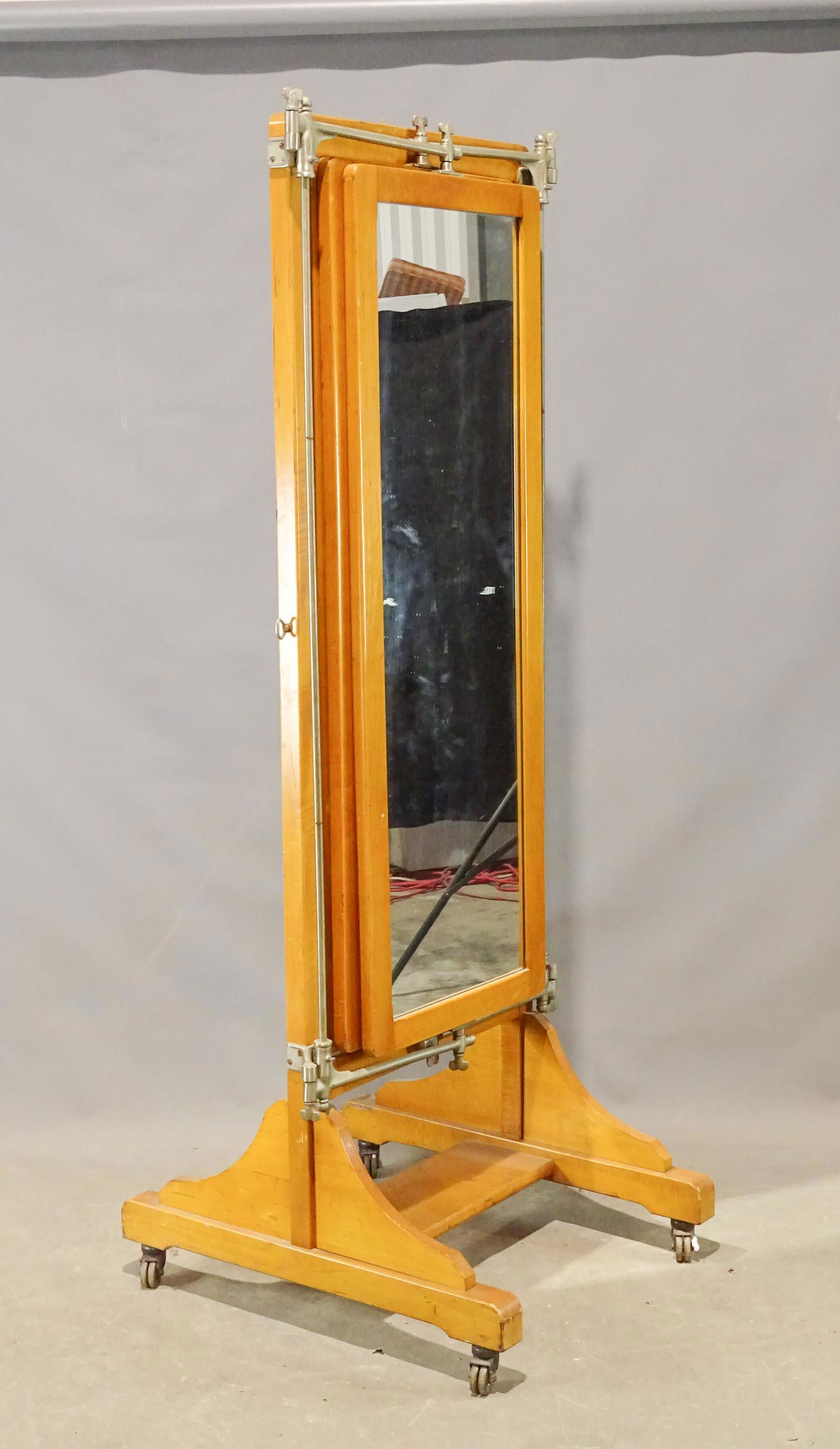 SoldVintage Commercial Size Clothing Store Mirror.Wonderful size with anodized bronze finish on scissor action hanging bracket. Floral shaped wall mount. Cast iron ring around heavy beveled mirror. Ca. 1910-1920. Closed, 26-1/2" H x 13-1/2" WSee Sold Price