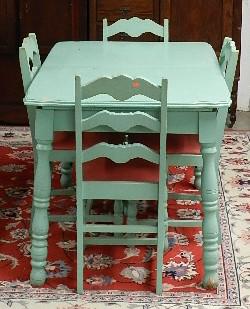 Vintage card table & 4 folding chairs, circa 1950's, it opens up to a double size table, with hiddenVintage card table & 4 folding chairs, circa 1950's, it opens up to a double size table, with hidden leaf underneath, chairs are wonderful form, one small slit on one side of the top, does not detract